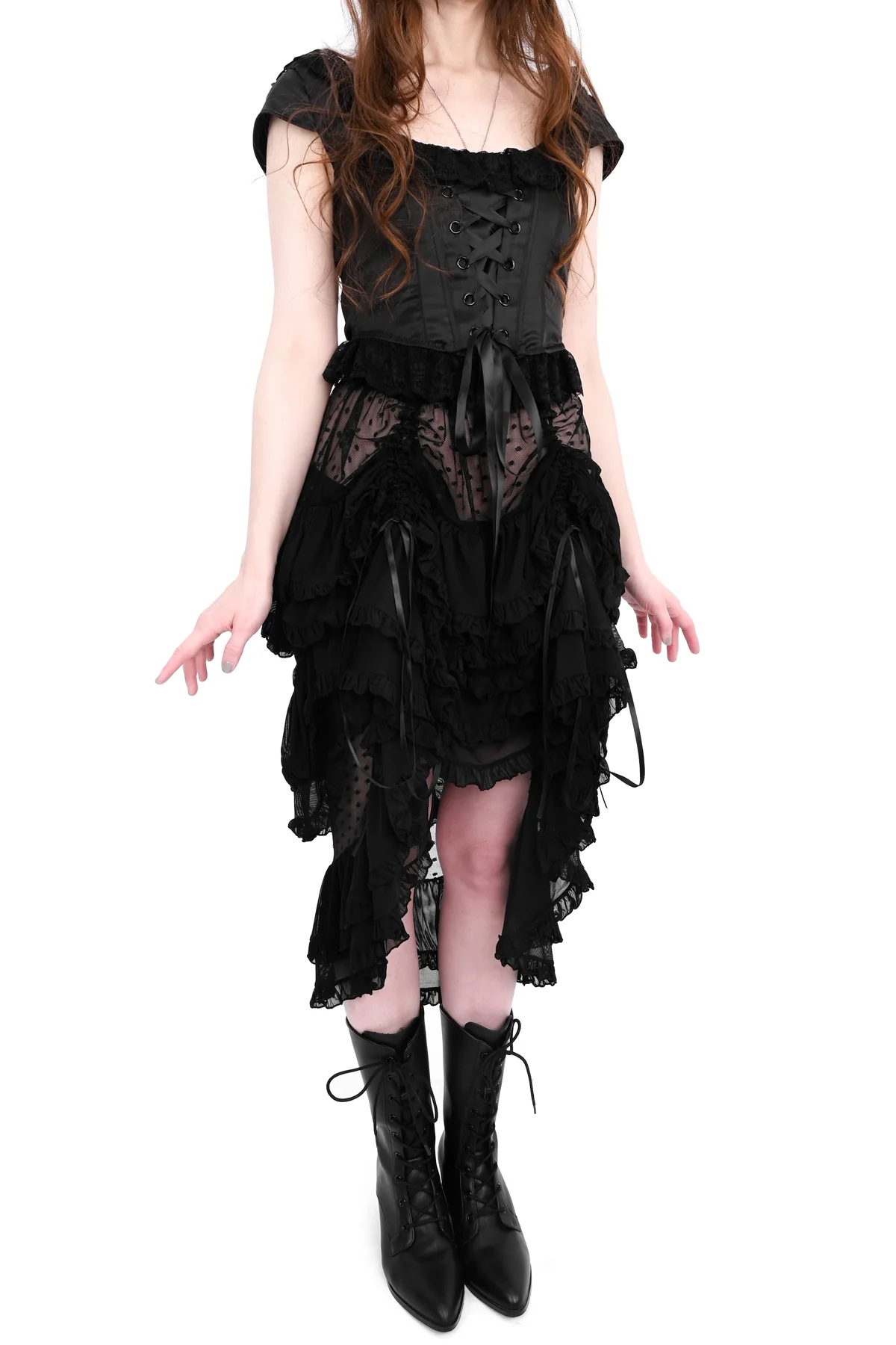 Kerrostettu röyhelöhame, jossa yhdistyy yksivärinen ja pilkullinen mesh-kangas.