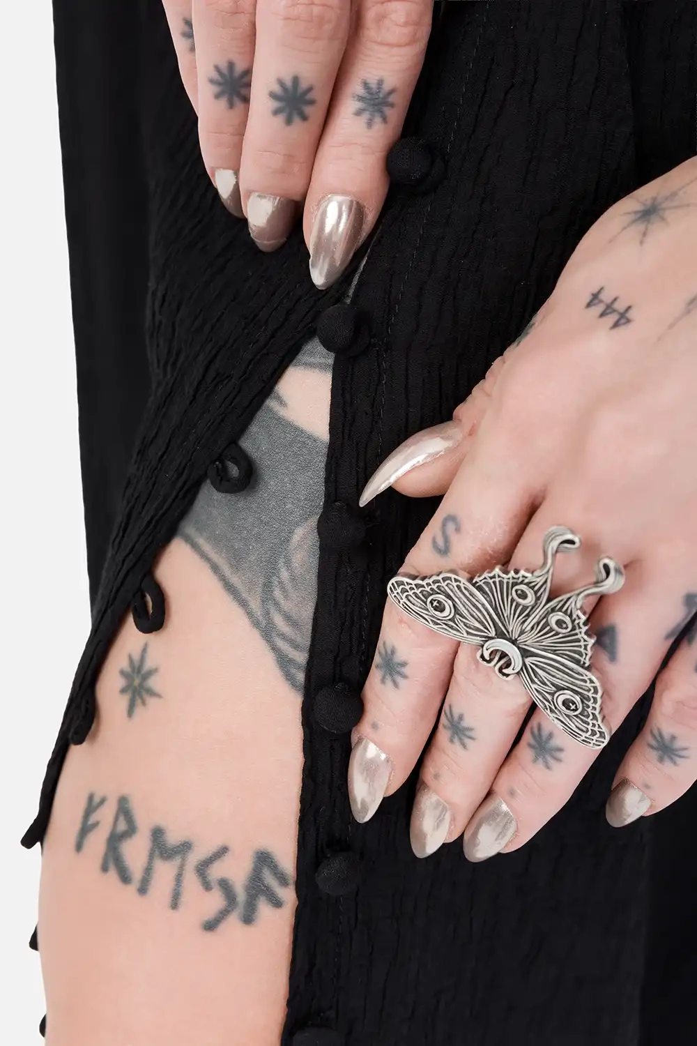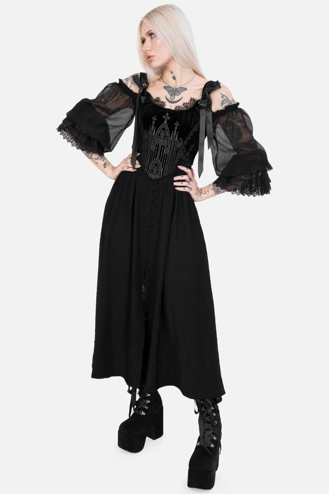 Tumman romantiikan ja noitamaisen eleganssin ylistys. Tämä hulmuava, eteerinen maksimekko tuo mieleen keskiyön rituaalit ja metsän mystiikan. Sopii täydellisesti trad goth-, whimsigoth- ja gothic boho -tyyleihin – yhdistä korsettivyöhön tai kerroksellisiin koruihin, ja saat taianomaisen lookin.