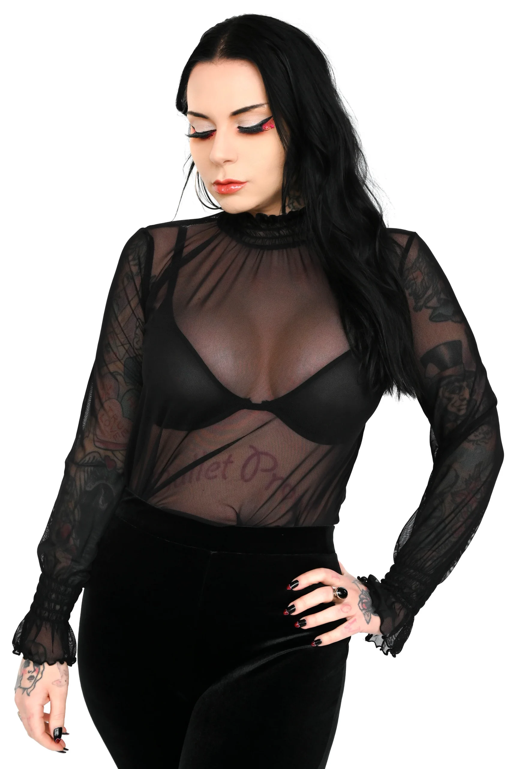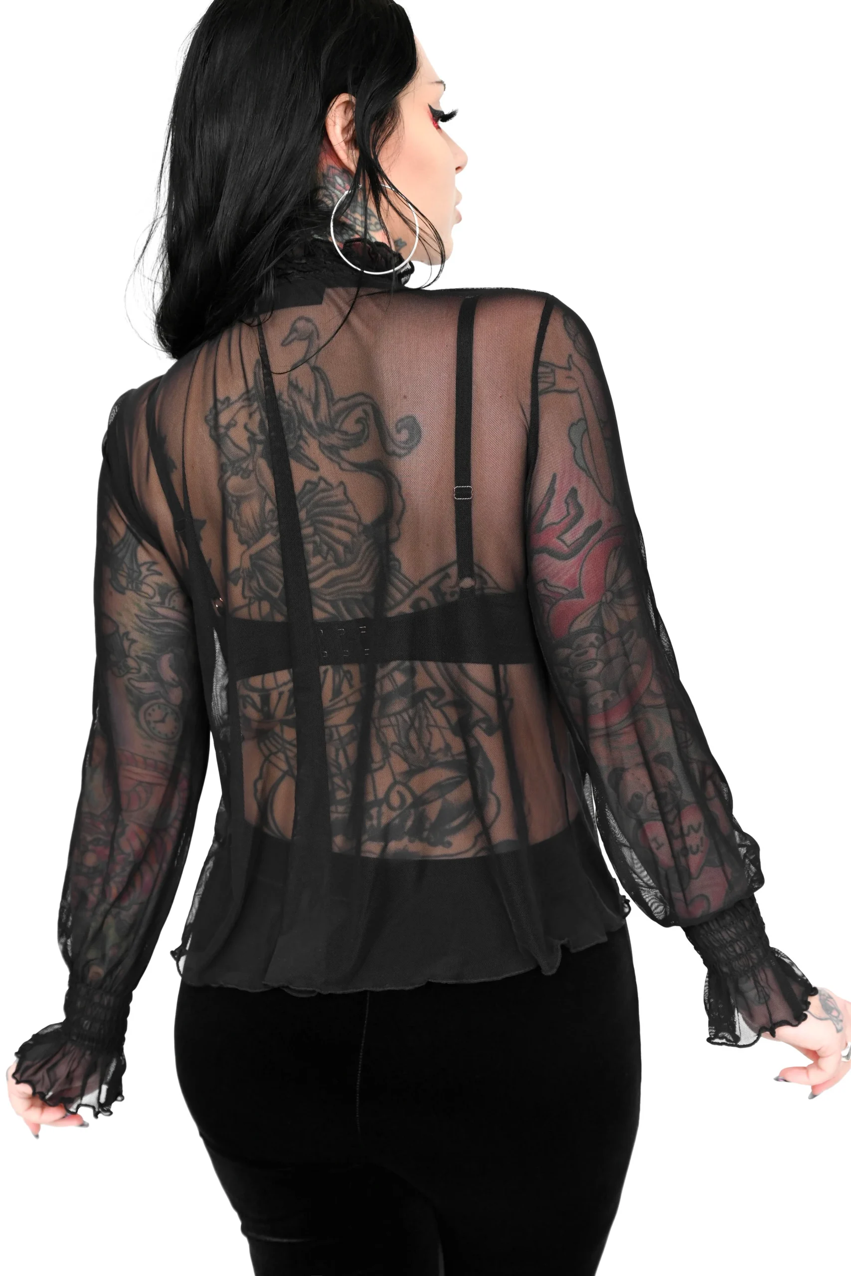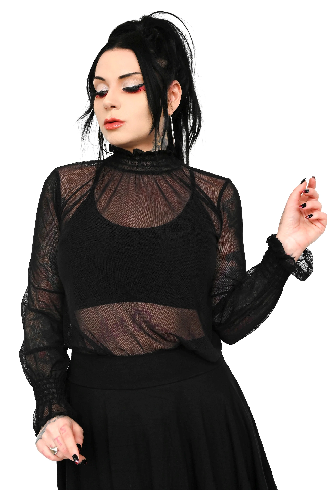 Kevyt ja joustava musta mesh‑paita, täydellinen kerrospukeutumiseen mekkojen, toppien tai liivihameiden alle. Rypytetty kaulus ja hihat tuovat ilmettä, ja neljään suuntaan joustava materiaali tekee istuvuudesta mukavan ja napakan. Osa Foxbloodin Signature‑mallistoa, suunniteltu ja valmistettu Los Angelesissa.