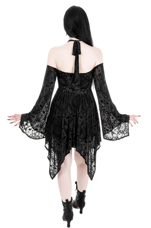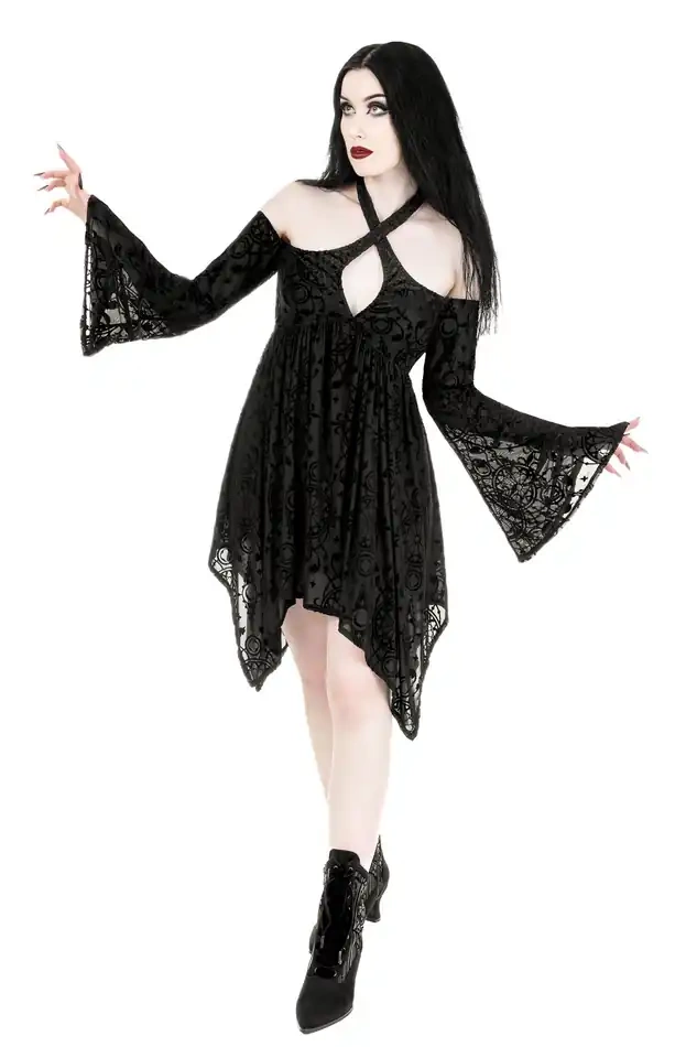 Tämä polttokuvioitu goottimekko yhdistää mystiikan ja eleganssin – täydellinen niille, jotka rakastavat dramaattista tyyliä ja eteeristä kauneutta.