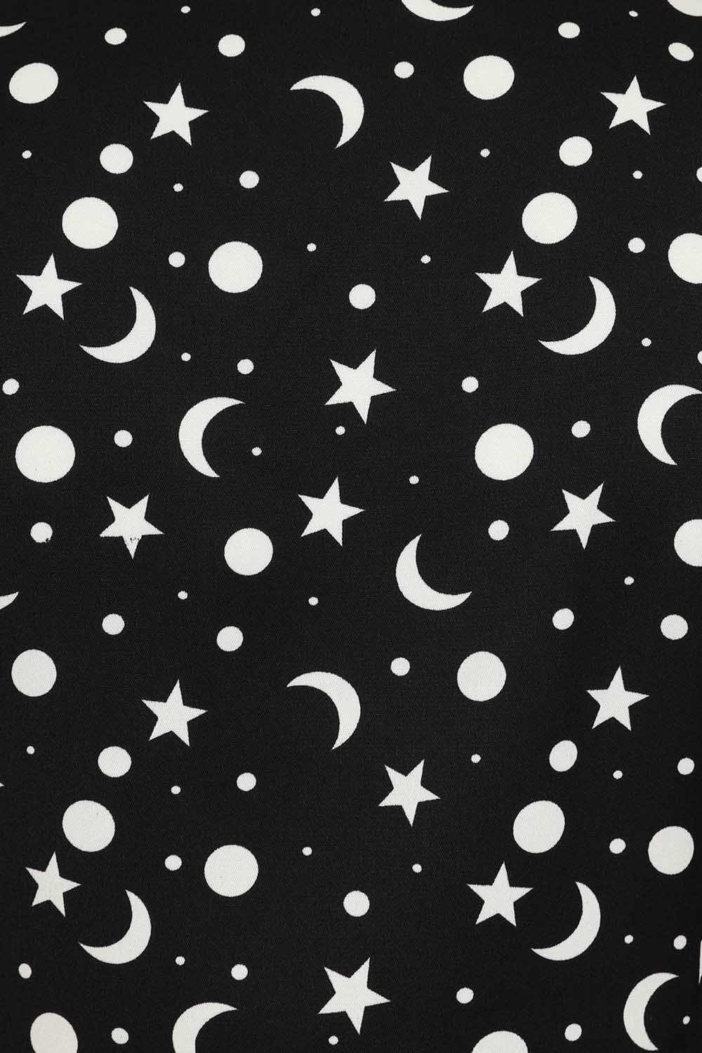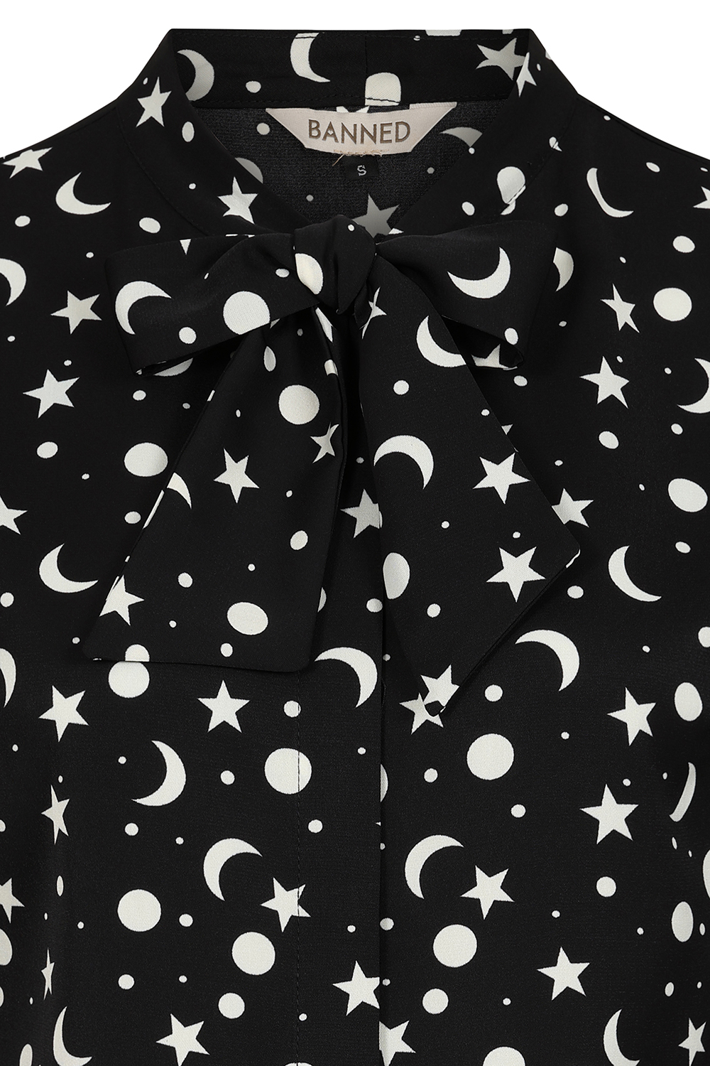 ”This Banned Retro 1960’s influenced woven pussy bow blouse in a star and moon print is giving groovy vibes. This fun style can be dressed up or down to suit any mood!”