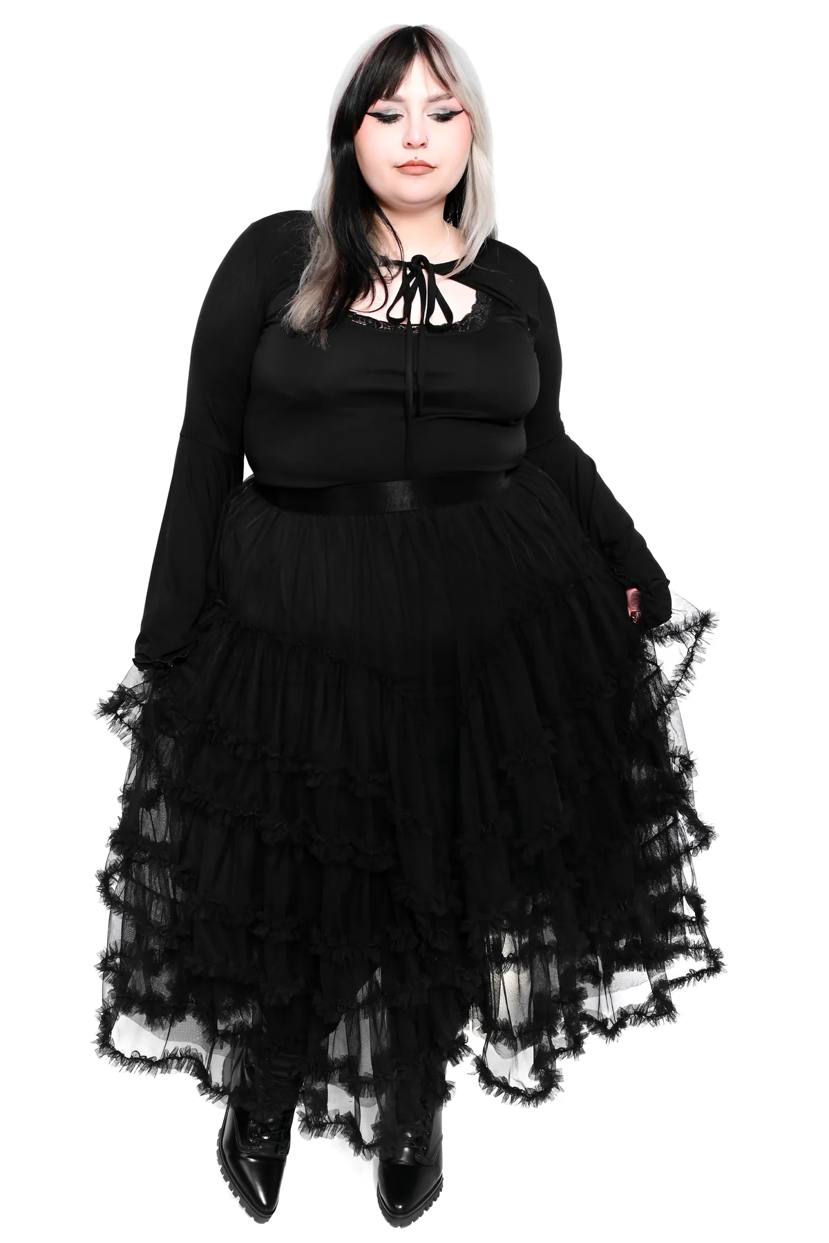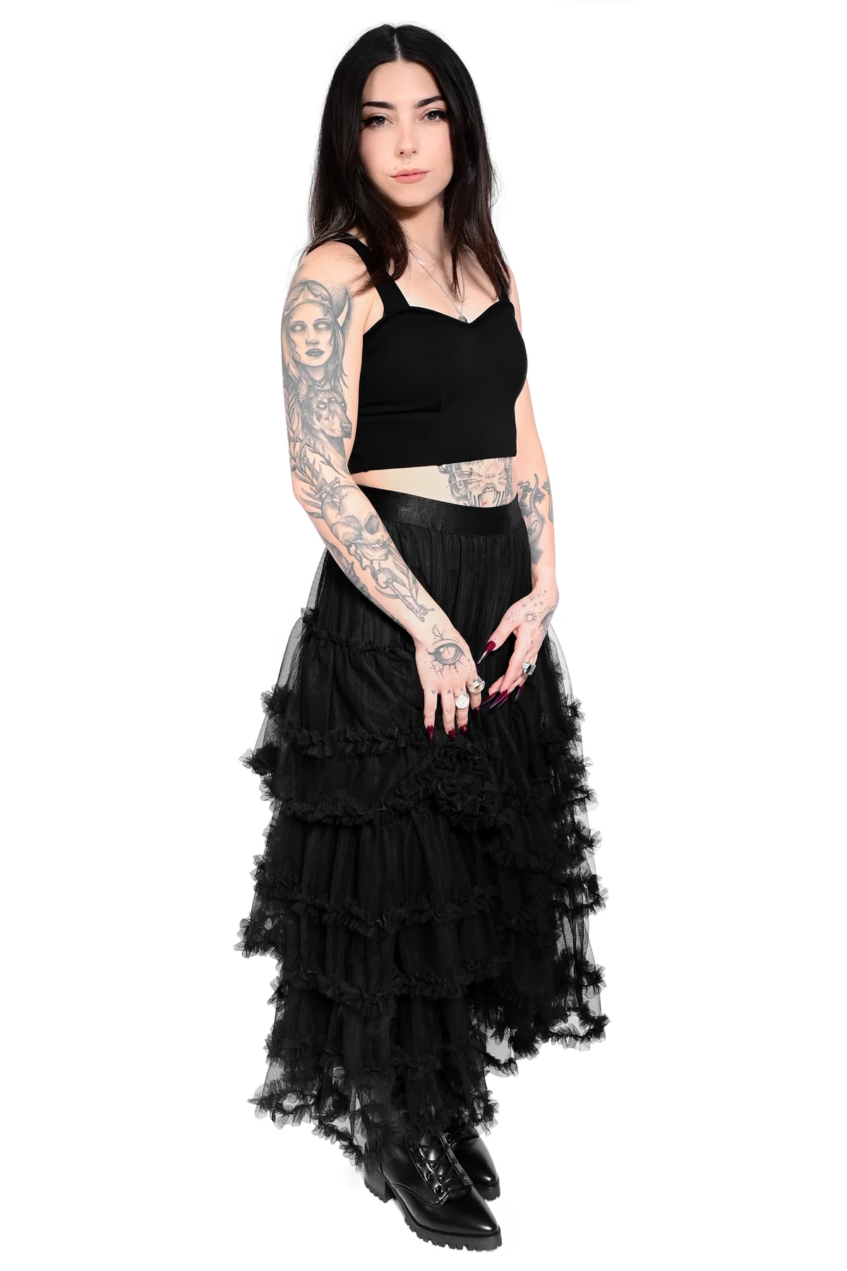 Kerrostettu musta tyllihame, jossa pehmeä vuori sisäpuolella. Pituus on hieman midi‑mitan yli – täydellinen sekä arkeen että juhlaan.