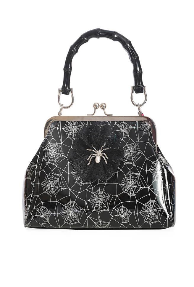 Killian‑käsilaukku, verkkomaiset ja glitterpintaiset kuviot tuovat laukkuun dramaattista hohtoa, kun taas etuosan metallinen hämähäskoriste viimeistelee ilmeen rohkealla, hieman mystisellä twistillä.