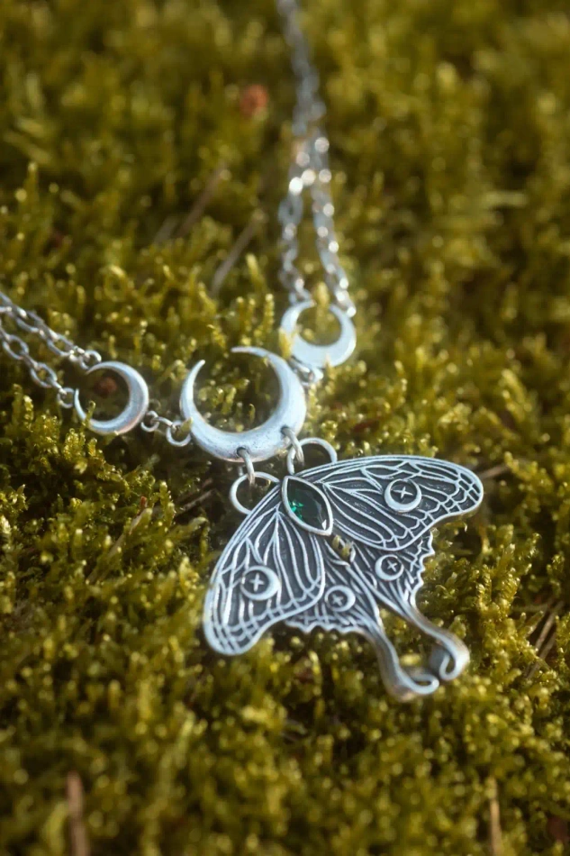 Hopeansävyinen choker‑kaulakoru, jossa keskellä on yksityiskohtainen luna‑koi ja syvän smaragdinvihreä fasetoitu kristalli. Korua kehystävät sirppikuut, jotka tuovat siihen kuunvaiheiden symboliikkaa ja metsän mystiikkaa. Säädettävä ketju mahdollistaa istuvuuden joko tiukkana chokerina tai lyhyenä kaulakoruna.