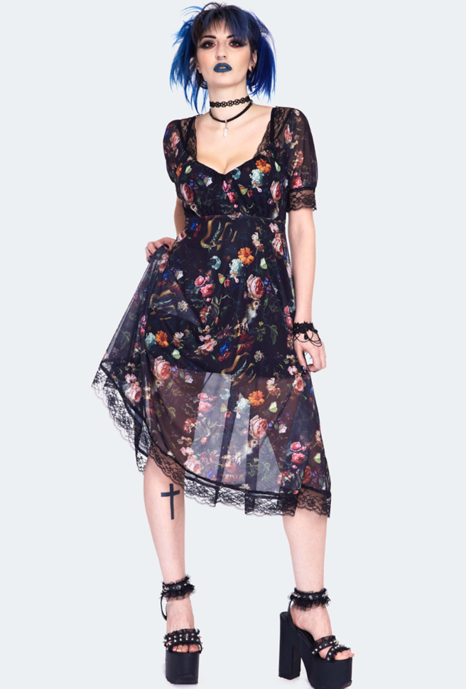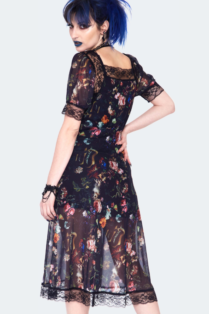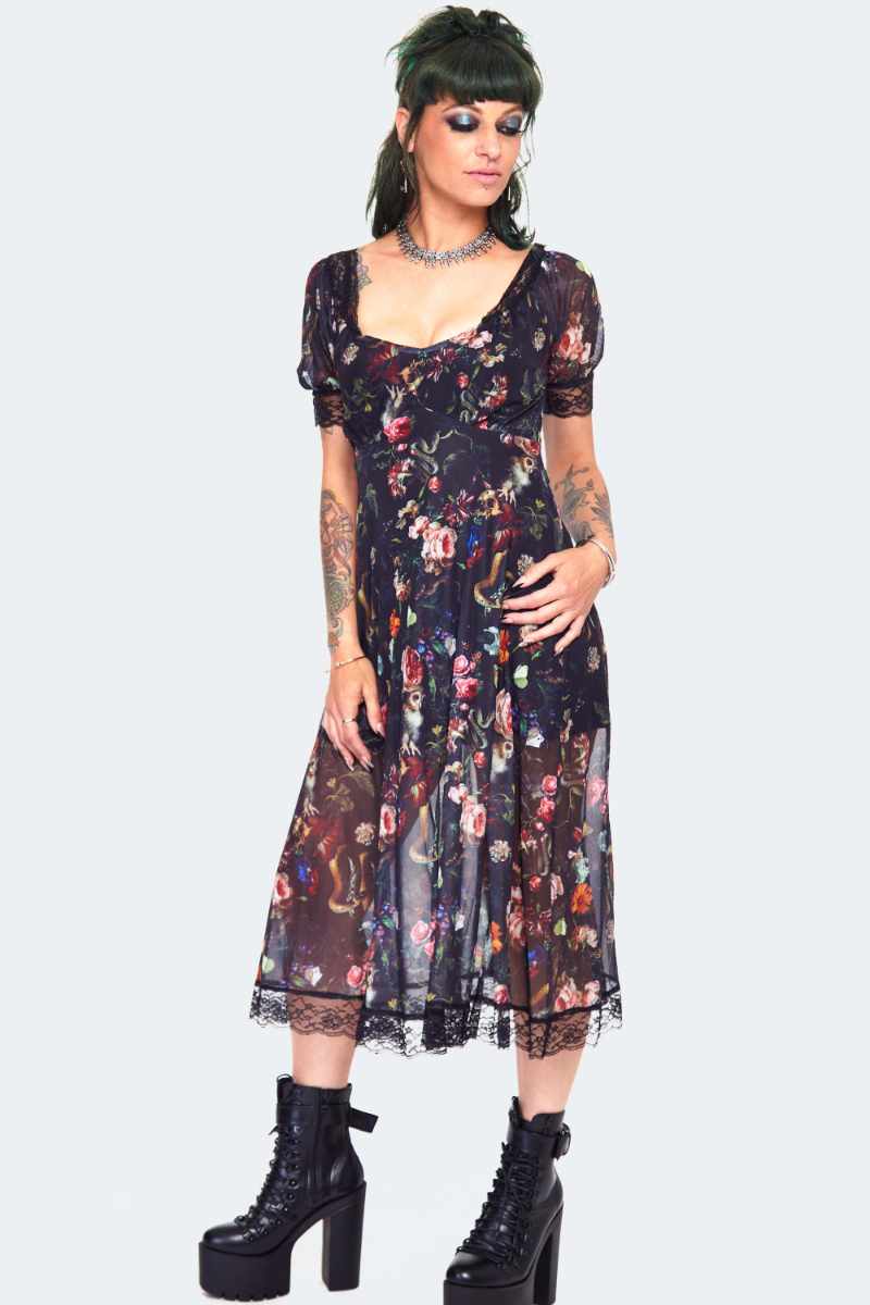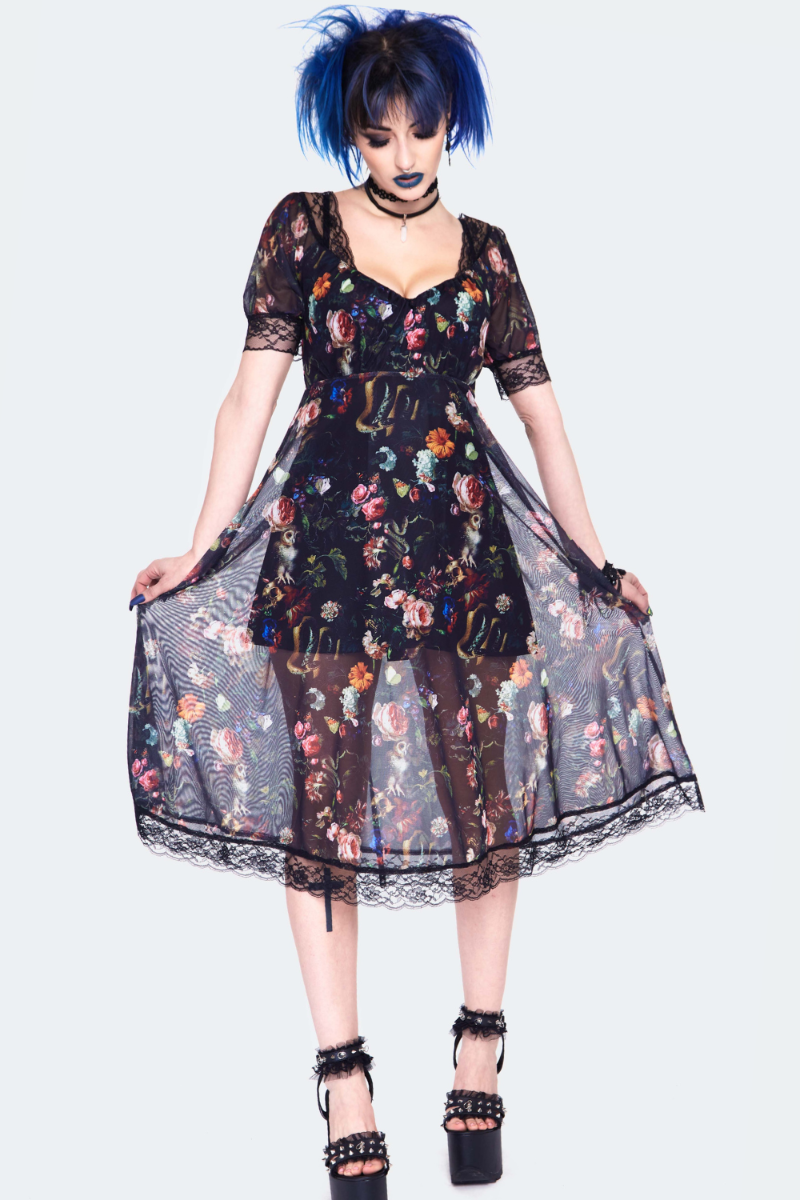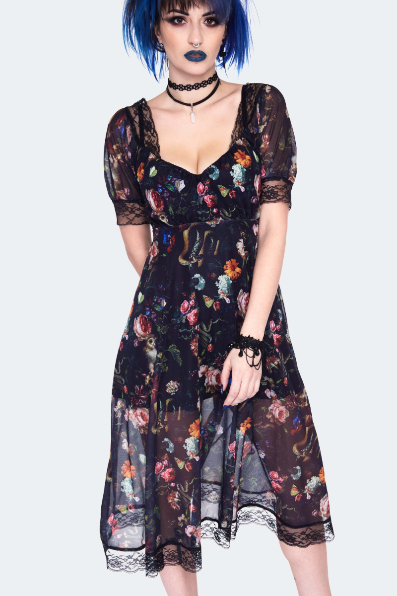 Tunne itsesi iltatarhan lumoojattareksi tässä pitsisomisteisessa midimekossa. Kevyt, painokuvioitu mesh laskeutuu kauniisti ja luo eteerisen, yön puutarhasta inspiroituneen ilmeen. 🌙