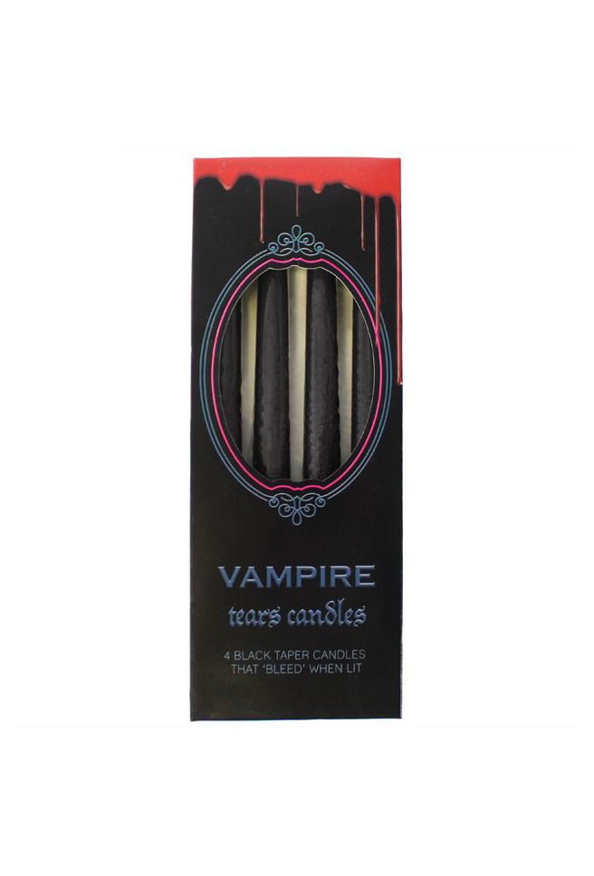 ”4 kappaleen Vampire Tears -kynttiläpakkaus, joiden arvioitu palamisaika on noin 2 tuntia per kynttilä. Kun nämä mustat kynttilät sytytetään ja vahasta alkaa sulaa, se muuttuu punaiseksi, mikä antaa niille nimen ”Vampire Candles”